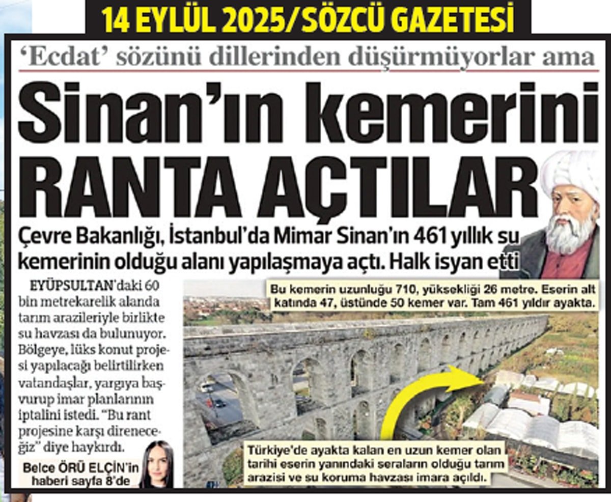 iktidarın rant hırsı ve bütçeye kaynak yaratma çalışmaları yüzlerce yıllık tarihi eserlere kadar uzanırken, Mimar Sinan’ın mirası ve eseri olan su kemerlerinin çevresinin imara açılma- sına bir tepki de Tarihçi Prof. Dr. İlber Ortaylı’dan geldi.