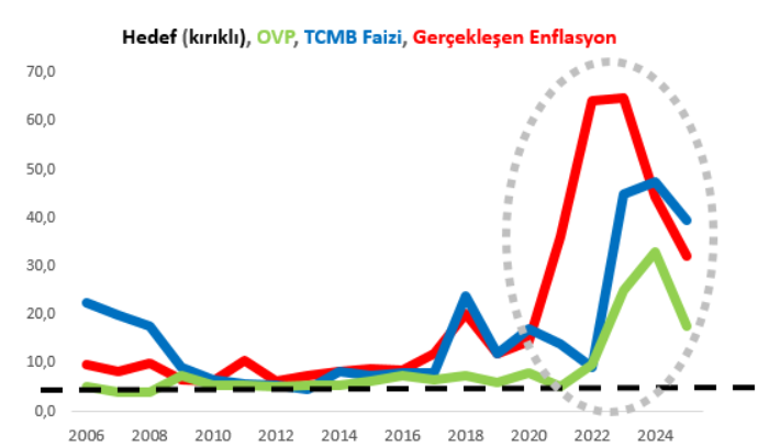 Eğilmez, yazısında enflasyon hedefleri, Orta Vadeli Program (OVP) tahminleri, gerçekleşen enflasyon, sapmalar ve politika faizlerine yer verdiği bir tablo paylaşarak şunları kaydetti: